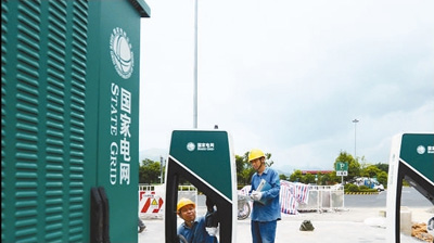7月22日,國網浙江杭州余杭區供電公司工作人員來到杭長高速徑山服務區內,為即將投運的首批高速公路服務區電動汽車充電樁進行調試。 |